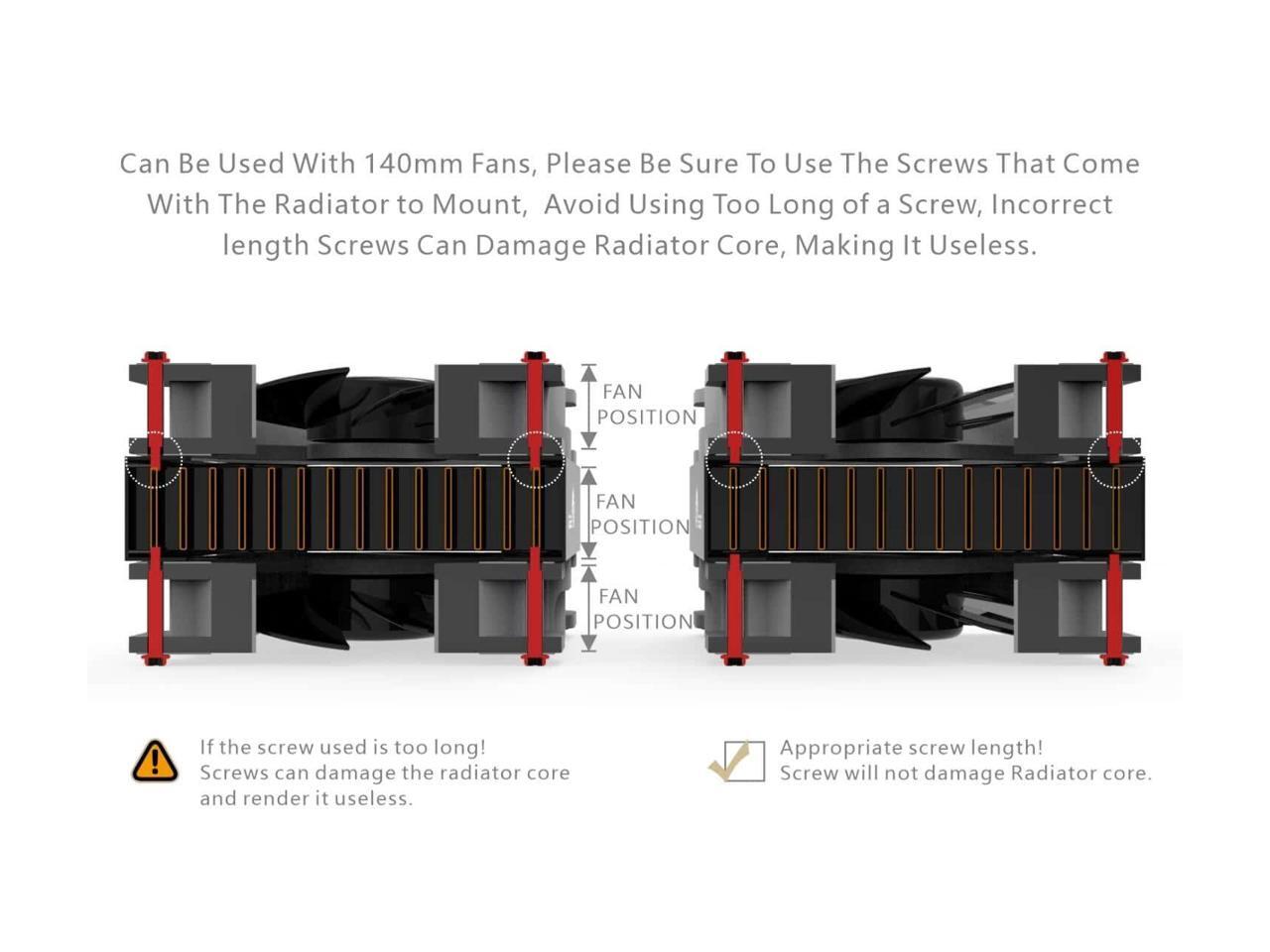 - Included Parts: 1x Radiator, 8x M3 x 30mm Mounting Hardware, 8x M3 x 6mm Mounting Hardware. The radiator is formed by a high-temperature integrated soldering process. Due to this, there will be a slight color change in the copper, this is a result of the process, not rust. Please pay attention to the length of the screw. If the screw is too long, it will break through the radiator and cause water leakage, voiding the warranty. Radiator comes with M3X30mm screws sui