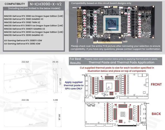 This is a repair or replacement-only item. Returns are not accepted on compatibility issues or if the block has had water/fluid run through it. The manufacturer reserves the right to alter the block design to expand compatibility. The delivered item may not 100% match the pictured item. The product does NOT come with English instructions. Please see the product gallery images for the install guide if available. Generally, thermal pads should be installed on the card where the block has corresponding raised contact points, except the GPU core, which uses thermal paste. Installing pads on other components can lead to improper contact and poor performance.