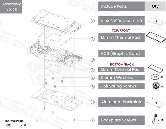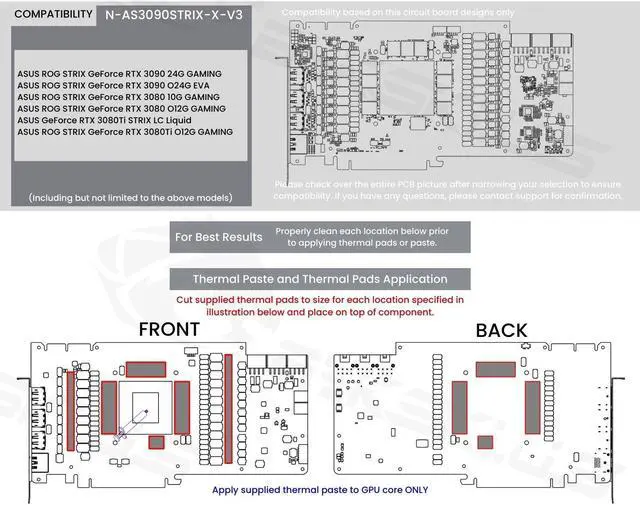 The manufacturer may modify the block design to enhance compatibility, so the received item may not be an exact match with the item pictured. Please note that the product does not include English instructions. If available, refer to the product gallery images for the installation guide. It is recommended to install thermal pads on the card where the block has corresponding raised contact points, except for the GPU core, which requires thermal paste. Incorrectly placing pads on other components can result in poor contact and reduced performance.