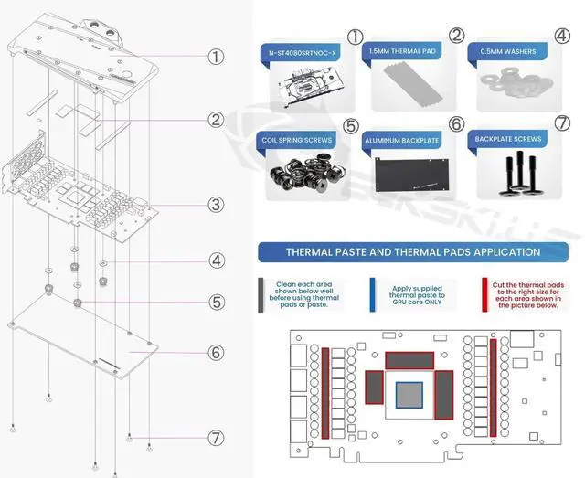 Generally, thermal pads should be installed on the card where the block has corresponding raised contact points, except the GPU core, which uses thermal paste. Installing pads on other components can lead to improper contact and poor performance.