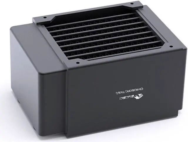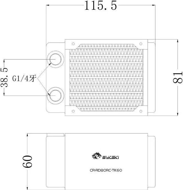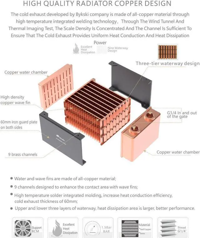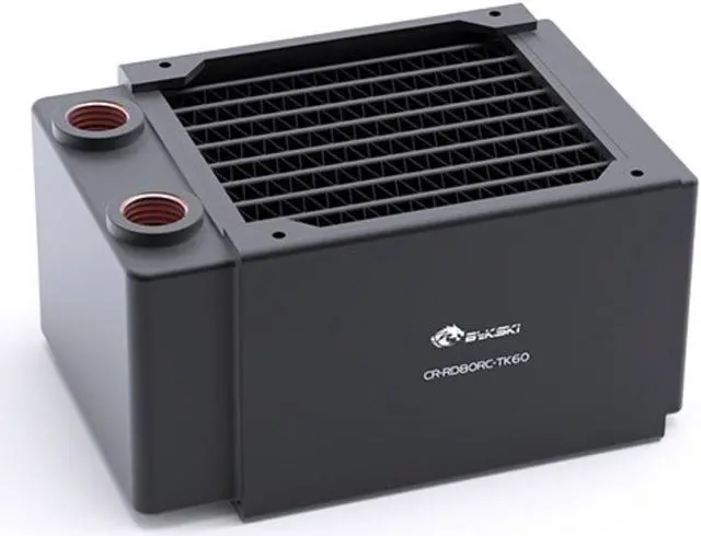 Bykski CR-RD80XRC-TK60 radiator is designed as a single row of copper channels. The thickness of the radiator is a massive 60mm which gives this radiator superior cooling power. The water channels and wave fins are made of red copper with a thermal conductivity up to 401 w/(M.K.). There are 9 water channels aligned in a single row.