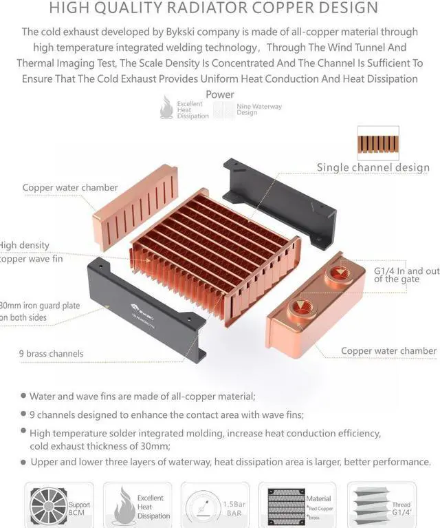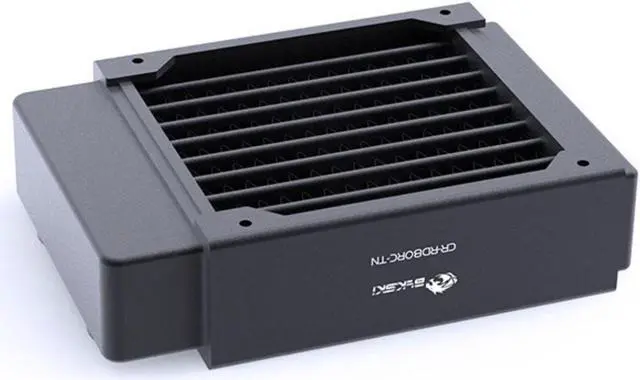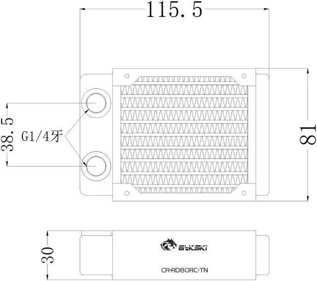 Bykski CR-RD80XRC-TN radiator is designed as a single row of copper channels.KEY_TAB The thickness of the radiator is 30mm whichKEY_TAB allows this radiator to be mounted in smaller profile locations.KEY_TAB The water channels and wave fins are made of red copper with a thermal conductivity up to 401 w/(M.K.). There are 9 water channels aligned in a single row.