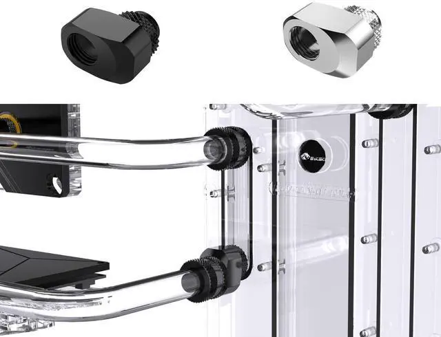 The Bykski CC-HR-10-X G1/4in. Rotary Offset Degree Fittings are made of CNC machined brass with a high quality surface treatment process. They feature G1/4 thread, can rotate 360 degrees around its axis, and can be fine-tuned and find the exact positioning needed. Seals are made of high quality rubber.