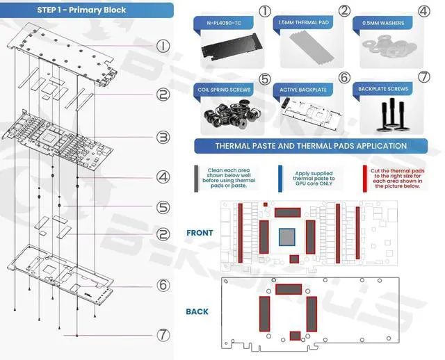 Generally, thermal pads should be installed on the card where the block has corresponding raised contact points, except the GPU core, which uses thermal paste. Installing pads on other components can lead to improper contact and poor performance.