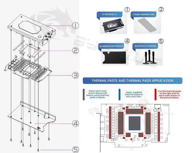 Generally, thermal pads should be installed on the card where the block has corresponding raised contact points, except the GPU core, which uses thermal paste. Installing pads on other components can lead to improper contact and poor performance.