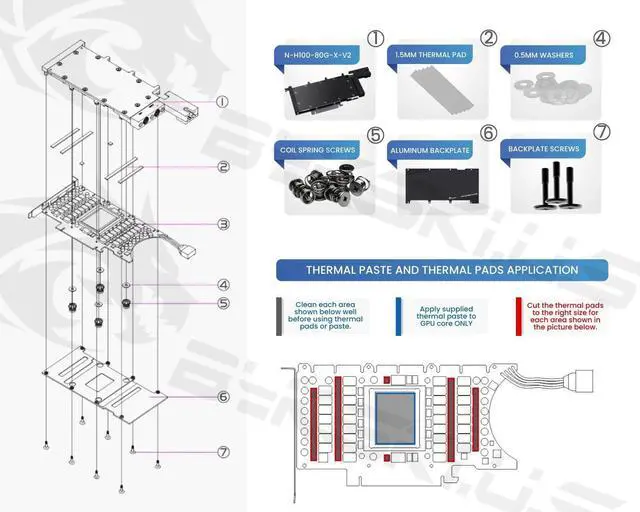 Generally, thermal pads should be installed on the card where the block has corresponding raised contact points, except the GPU core, which uses thermal paste. Installing pads on other components can lead to improper contact and poor performance.