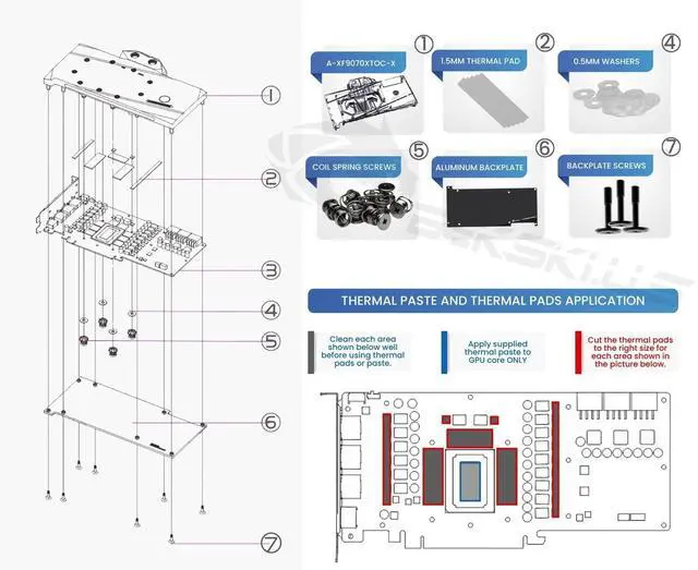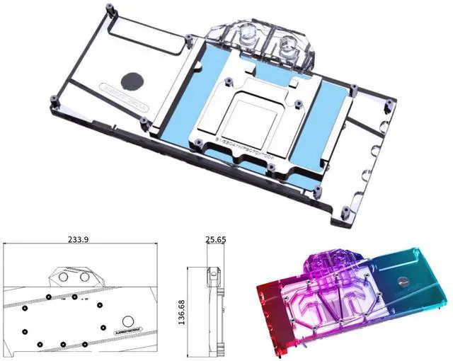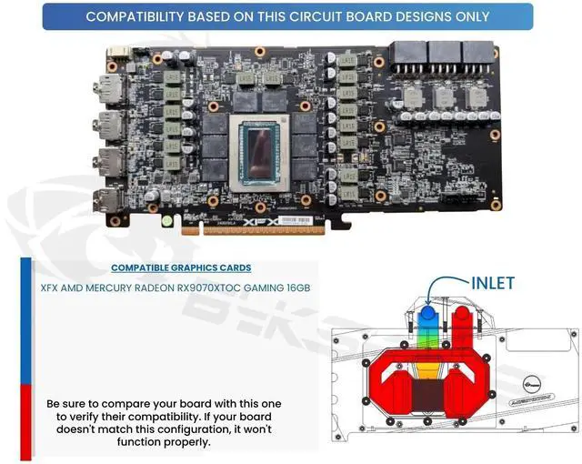 This A-XF9070XTOC-X full-coverage block directly cools the video card core (GPU), graphics memory (RAM), and voltage regulator modules (VRM). By directly cooling these components, you can achieve great temperatures and reach higher overclocks while extending the overall lifespan of your card by running at lower temperatures.