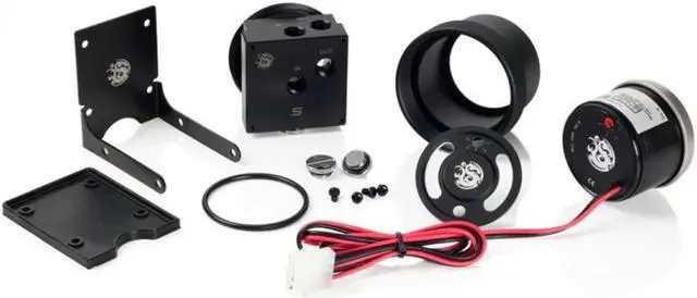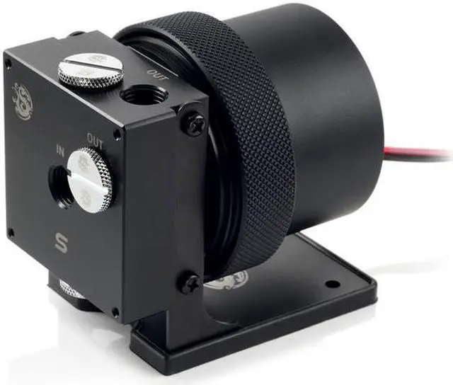 Bitspower D5 Vario Pump, Top And Cooler in matte black.