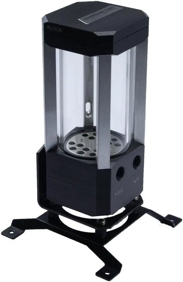 The top part can swing freely and is decoupled from the bottom part via rubber dampeners. No vibrations will be transferred from a HEATKILLER® D5 or DDC Tube reservoir to the PC case when it is mounted with this stand, resulting in ultra silent operations.