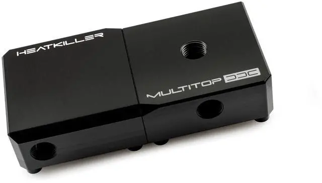 The new HEATKILLER® Multitop series for Lowara/Laing DDC pumps is characterized by its unique construction and expandability. The Multitop X2 is manufactured from a solid, 30mm thick acetal block and convinces with an outstanding quality of workmanship. The internal channel structure has been optimized for delivery head and flow capacity. Our complex manufacturing process allows us to mill the positioning attachments from one block. This results in less vibration at the transition to the pump and therefore also contributes to quieter operation. It also greatly simplifies installation. The Multitop X2 provides a serial connection of two DDC pumps and thereby increases the delivery head.