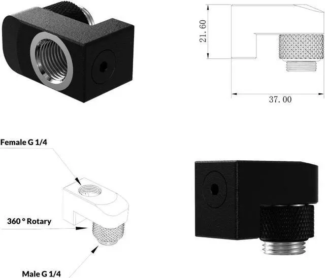 • Package includes 1x PrimoChill Male to Female G 1/4in. Supported Offset Rotary Fitting and 1x Installed oring on male threaded side for a secure and leak-free connection.