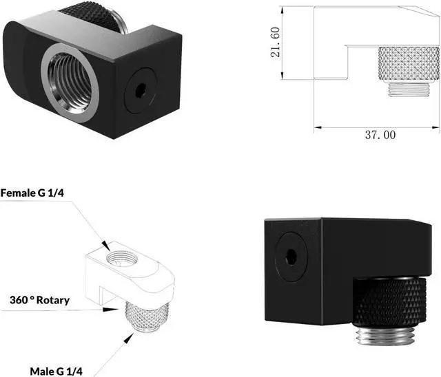 • Package includes 1x PrimoChill Male to Female G 1/4in. Supported Offset Rotary Fitting and 1x Installed oring on male threaded side for a secure and leak-free connection.
