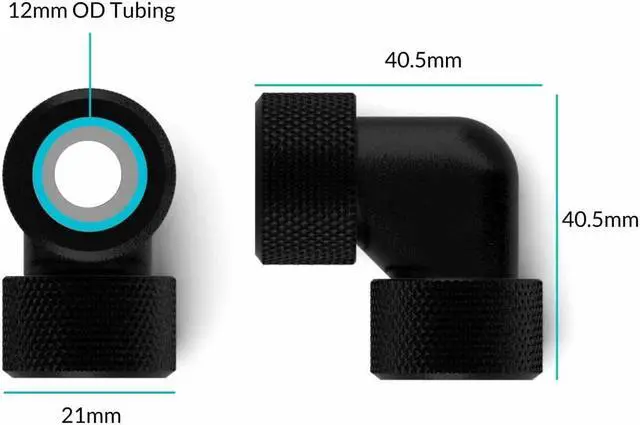 The PrimoChill 12mm Rigid SX 90 Degree Fitting Set is for 12mm outside diameter rigid tubing. This fitting combination allows you to make a compact 90 degree bend without altering your tubing.