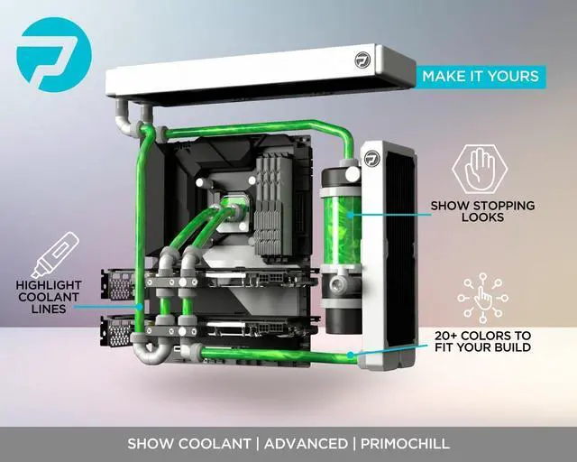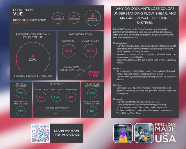 PrimoChills Vue was specifically developed for that experienced user looking to create an unrivaled aesthetic in their liquid cooled PC. Vue's exclusive water-based formulation allows it to stay suspended longer allowing longevity and an easy flush to any system. Released in 2017, Vue has withstood the test of time and is still a favorite show fluid in the watercooling community. With its unique visual traits, Vue is sure to bring another dimension to any loop.