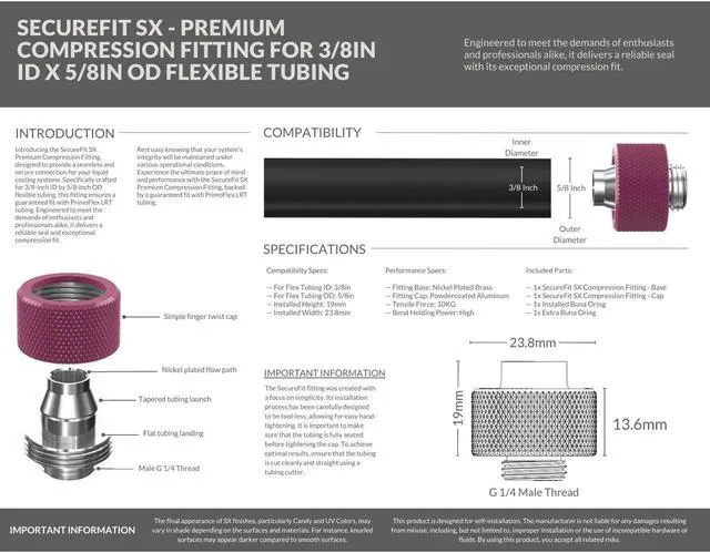 Introducing the SecureFit SX Premium Compression Fitting, designed to provide a seamless and secure connection for your liquid cooling systems. Specifically crafted for 3/8-inch ID by 5/8-inch OD flexible tubing, this fitting ensures a guaranteed fit with PrimoFlex LRT tubing. Engineered to meet the demands of enthusiasts and professionals alike, it delivers a reliable seal and exceptional compression fit. Rest easy knowing that your system's integrity will be maintained under various operational conditions. Experience the ultimate peace of mind and performance with the SecureFit SX Premium Compression Fitting, backed by a guaranteed fit with PrimoFlex LRT tubing.