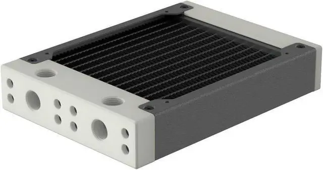 The internal core is designed with seven dual-pass coolant channels made of copper, which ensures efficient system flow and effective cooling. The layout of an all-copper fin is precisely engineered to maximize performance without needing high-speed fans, thus maintaining the Eximo's top-tier cooling performance. The newly designed inlet tank features a total of four ports (two inlets and two outlets), providing users with the flexibility to connect coolant lines from either a horizontal or vertical direction. The slim end plate reduces the radiator's total length and makes installation easier in space-confined computer cases. You can remove both tanks to gain direct access to the inner core. This allows you to perform maintenance and cleaning on the core when replacing coolants or rebuilding your loop.