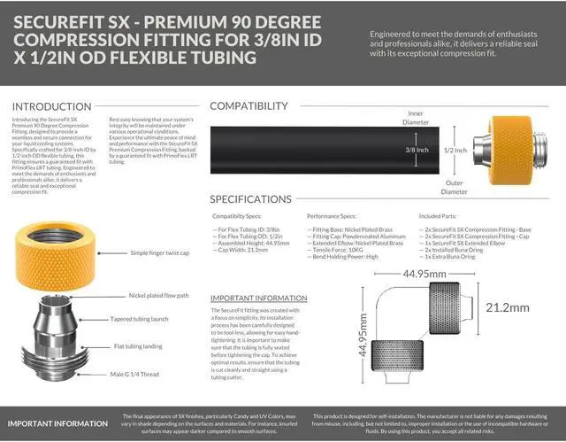 Introducing the SecureFit SX Premium 90 Degree Compression Fitting Set, designed to provide a seamless and secure connection for your liquid cooling systems. Specifically crafted for 3/8-inch ID by 1/2-inch OD flexible tubing, this fitting set ensures a guaranteed fit with PrimoFlex LRT tubing. Engineered to meet the demands of enthusiasts and professionals alike, it delivers a reliable seal and exceptional compression fit. Rest easy knowing that your system's integrity will be maintained under various operational conditions. Experience the ultimate peace of mind and performance with the SecureFit SX Premium Compression Fitting, backed by a guaranteed fit with PrimoFlex LRT tubing.