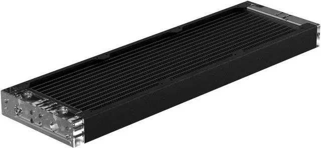 The internal core is designed with seven dual-pass coolant channels made of copper, which ensures efficient system flow and effective cooling. The layout of an all-copper fin is precisely engineered to maximize performance without needing high-speed fans, thus maintaining the Eximo's top-tier cooling performance. The newly designed inlet tank features a total of four ports (two inlets and two outlets), providing users with the flexibility to connect coolant lines from either a horizontal or vertical direction. The slim end plate reduces the radiator's total length and makes installation easier in space-confined computer cases. You can remove both tanks to gain direct access to the inner core. This allows you to perform maintenance and cleaning on the core when replacing coolants or rebuilding your loop.