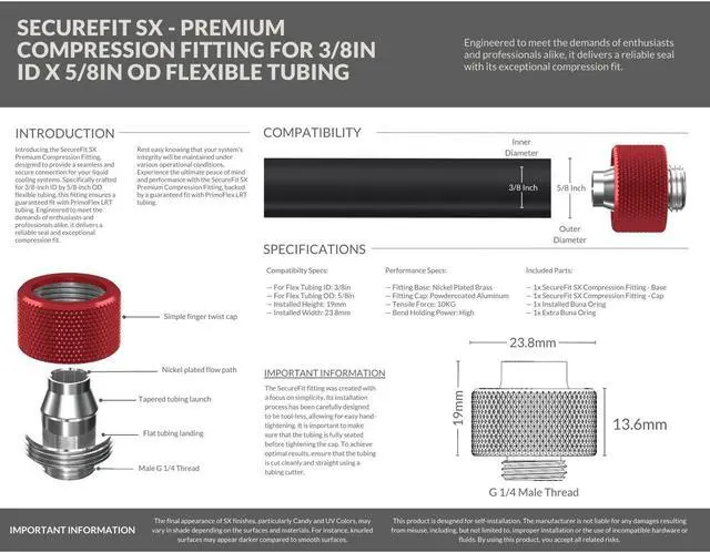 Introducing the SecureFit SX Premium Compression Fitting, designed to provide a seamless and secure connection for your liquid cooling systems. Specifically crafted for 3/8-inch ID by 5/8-inch OD flexible tubing, this fitting ensures a guaranteed fit with PrimoFlex LRT tubing. Engineered to meet the demands of enthusiasts and professionals alike, it delivers a reliable seal and exceptional compression fit. Rest easy knowing that your system's integrity will be maintained under various operational conditions. Experience the ultimate peace of mind and performance with the SecureFit SX Premium Compression Fitting, backed by a guaranteed fit with PrimoFlex LRT tubing.