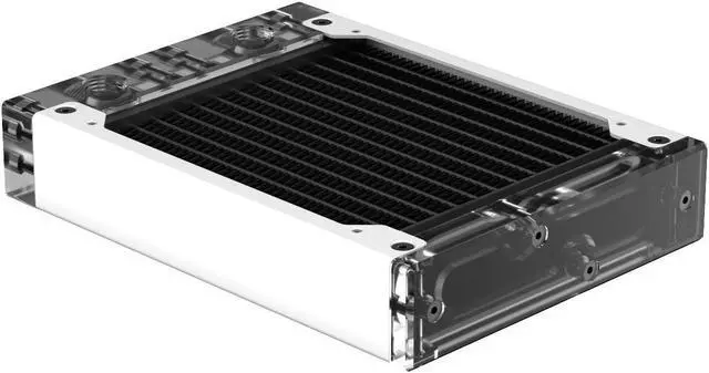 The internal core is designed with seven dual-pass coolant channels made of copper, which ensures efficient system flow and effective cooling. The layout of an all-copper fin is precisely engineered to maximize performance without needing high-speed fans, thus maintaining the Eximo's top-tier cooling performance. The newly designed inlet tank features a total of four ports (two inlets and two outlets), providing users with the flexibility to connect coolant lines from either a horizontal or vertical direction. The slim end plate reduces the radiator's total length and makes installation easier in space-confined computer cases. You can remove both tanks to gain direct access to the inner core. This allows you to perform maintenance and cleaning on the core when replacing coolants or rebuilding your loop.