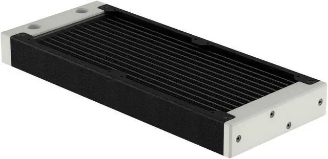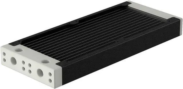 The internal core is designed with seven dual-pass coolant channels made of copper, which ensures efficient system flow and effective cooling. The layout of an all-copper fin is precisely engineered to maximize performance without needing high-speed fans, thus maintaining the Eximo's top-tier cooling performance. The newly designed inlet tank features a total of four ports (two inlets and two outlets), providing users with the flexibility to connect coolant lines from either a horizontal or vertical direction. The slim end plate reduces the radiator's total length and makes installation easier in space-confined computer cases. You can remove both tanks to gain direct access to the inner core. This allows you to perform maintenance and cleaning on the core when replacing coolants or rebuilding your loop.