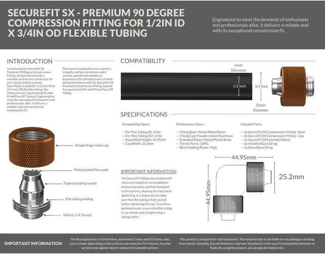 Introducing the SecureFit SX Premium 90 Degree Compression Fitting Set, designed to provide a seamless and secure connection for your liquid cooling systems. Specifically crafted for 1/2-inch ID by 3/4-inch OD flexible tubing, this fitting ensures a guaranteed fit with PrimoFlex LRT tubing. Engineered to meet the demands of enthusiasts and professionals alike, it delivers a reliable seal and exceptional compression fit. Rest easy knowing that your system's integrity will be maintained under various operational conditions. Experience the ultimate peace of mind and performance with the SecureFit SX Premium Compression Fitting, backed by a guaranteed fit with PrimoFlex LRT tubing.