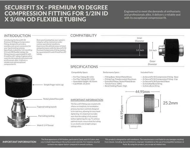 Introducing the SecureFit SX Premium 90 Degree Compression Fitting Set, designed to provide a seamless and secure connection for your liquid cooling systems. Specifically crafted for 1/2-inch ID by 3/4-inch OD flexible tubing, this fitting ensures a guaranteed fit with PrimoFlex LRT tubing. Engineered to meet the demands of enthusiasts and professionals alike, it delivers a reliable seal and exceptional compression fit. Rest easy knowing that your system's integrity will be maintained under various operational conditions. Experience the ultimate peace of mind and performance with the SecureFit SX Premium Compression Fitting, backed by a guaranteed fit with PrimoFlex LRT tubing.