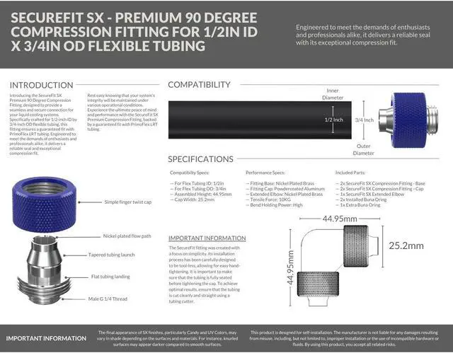 Introducing the SecureFit SX Premium 90 Degree Compression Fitting Set, designed to provide a seamless and secure connection for your liquid cooling systems. Specifically crafted for 1/2-inch ID by 3/4-inch OD flexible tubing, this fitting ensures a guaranteed fit with PrimoFlex LRT tubing. Engineered to meet the demands of enthusiasts and professionals alike, it delivers a reliable seal and exceptional compression fit. Rest easy knowing that your system's integrity will be maintained under various operational conditions. Experience the ultimate peace of mind and performance with the SecureFit SX Premium Compression Fitting, backed by a guaranteed fit with PrimoFlex LRT tubing.