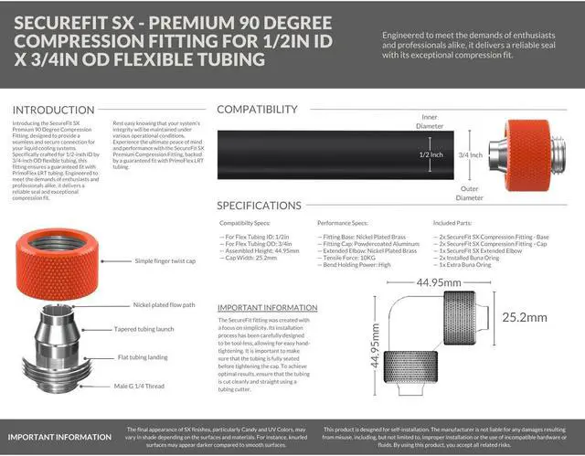 Introducing the SecureFit SX Premium 90 Degree Compression Fitting Set, designed to provide a seamless and secure connection for your liquid cooling systems. Specifically crafted for 1/2-inch ID by 3/4-inch OD flexible tubing, this fitting ensures a guaranteed fit with PrimoFlex LRT tubing. Engineered to meet the demands of enthusiasts and professionals alike, it delivers a reliable seal and exceptional compression fit. Rest easy knowing that your system's integrity will be maintained under various operational conditions. Experience the ultimate peace of mind and performance with the SecureFit SX Premium Compression Fitting, backed by a guaranteed fit with PrimoFlex LRT tubing.