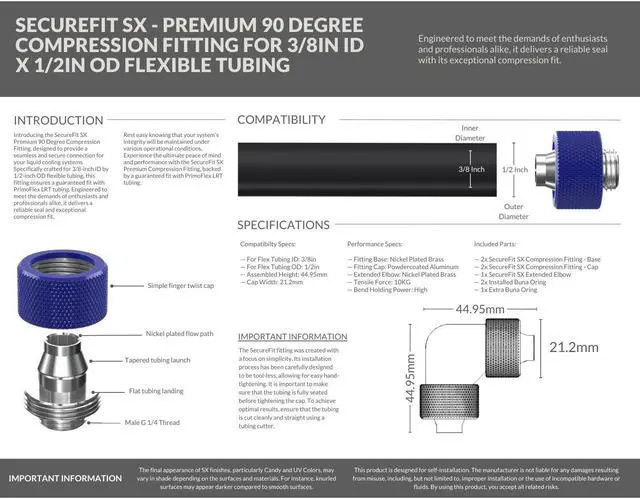 Introducing the SecureFit SX Premium 90 Degree Compression Fitting Set, designed to provide a seamless and secure connection for your liquid cooling systems. Specifically crafted for 3/8-inch ID by 1/2-inch OD flexible tubing, this fitting set ensures a guaranteed fit with PrimoFlex LRT tubing. Engineered to meet the demands of enthusiasts and professionals alike, it delivers a reliable seal and exceptional compression fit. Rest easy knowing that your system's integrity will be maintained under various operational conditions. Experience the ultimate peace of mind and performance with the SecureFit SX Premium Compression Fitting, backed by a guaranteed fit with PrimoFlex LRT tubing.