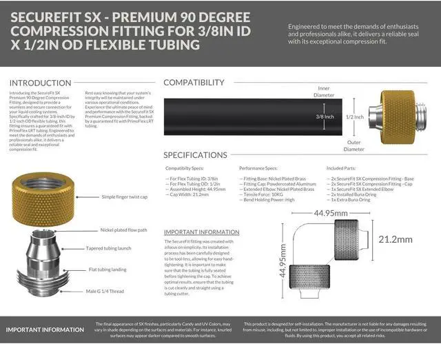 Introducing the SecureFit SX Premium 90 Degree Compression Fitting Set, designed to provide a seamless and secure connection for your liquid cooling systems. Specifically crafted for 3/8-inch ID by 1/2-inch OD flexible tubing, this fitting set ensures a guaranteed fit with PrimoFlex LRT tubing. Engineered to meet the demands of enthusiasts and professionals alike, it delivers a reliable seal and exceptional compression fit. Rest easy knowing that your system's integrity will be maintained under various operational conditions. Experience the ultimate peace of mind and performance with the SecureFit SX Premium Compression Fitting, backed by a guaranteed fit with PrimoFlex LRT tubing.
