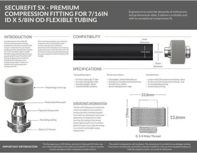 Introducing the SecureFit SX Premium Compression Fitting, designed to provide a seamless and secure connection for your liquid cooling systems. Specifically crafted for 7/16-inch ID by 5/8-inch OD flexible tubing, this fitting ensures a guaranteed fit with PrimoFlex LRT tubing. Engineered to meet the demands of enthusiasts and professionals alike, it delivers a reliable seal and exceptional compression fit. Rest easy knowing that your system's integrity will be maintained under various operational conditions. Experience the ultimate peace of mind and performance with the SecureFit SX Premium Compression Fitting, backed by a guaranteed fit with PrimoFlex LRT tubing.