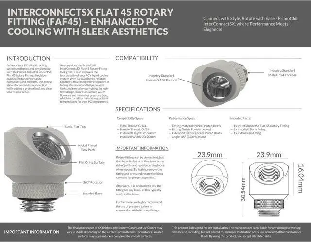 - 1 x PrimoChill InterConnectSX Flat 45 Rotary Fitting