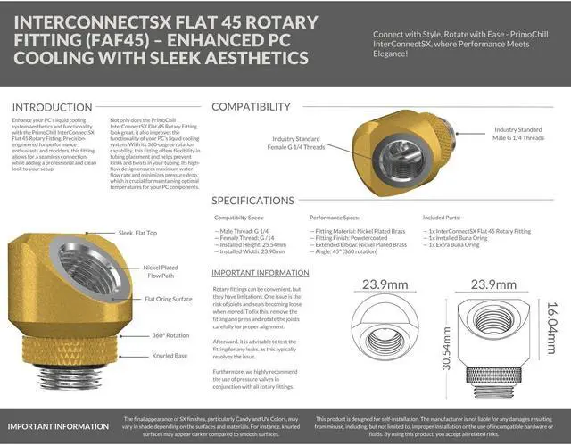 - 1 x PrimoChill InterConnectSX Flat 45 Rotary Fitting