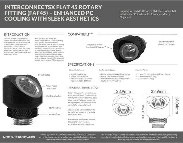- 1 x PrimoChill InterConnectSX Flat 45 Rotary Fitting