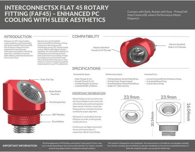 - 1 x PrimoChill InterConnectSX Flat 45 Rotary Fitting