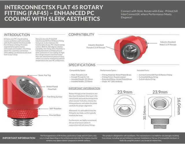 - 1 x PrimoChill InterConnectSX Flat 45 Rotary Fitting