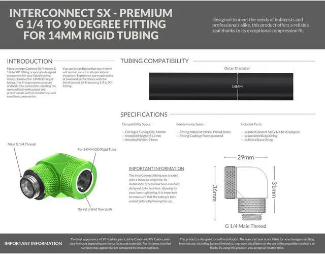 • SECURE INSTALLATION: HIGH-TOLERANCE FITTINGS THAT PROVIDES A SECURE AND LEAK-FREE CONNECTION TO YOUR COOLING COMPONENTS.