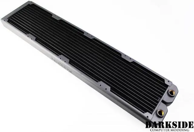DarkSide LP480 is an extreme Low Profile performance computer water-cooling radiator based on the latest radiator core design. Built for 120mm fans, this radiator is optimized for maximum heat dissipation for both low noise and performance fans. Radiator features ultra-compact design in two crucial dimensions: radiator thickness and radiator width. Lowered radiator thickness is essential for compact builds with limited clearance, while reduced radiator's width minimizes interference with computer components such as memory. Radiator side panels are tapped with UNC 6-32 threads on both sides to enable push-pull fan installation if desired. Two ports are ready for any G1/4 threaded fitting to be used.