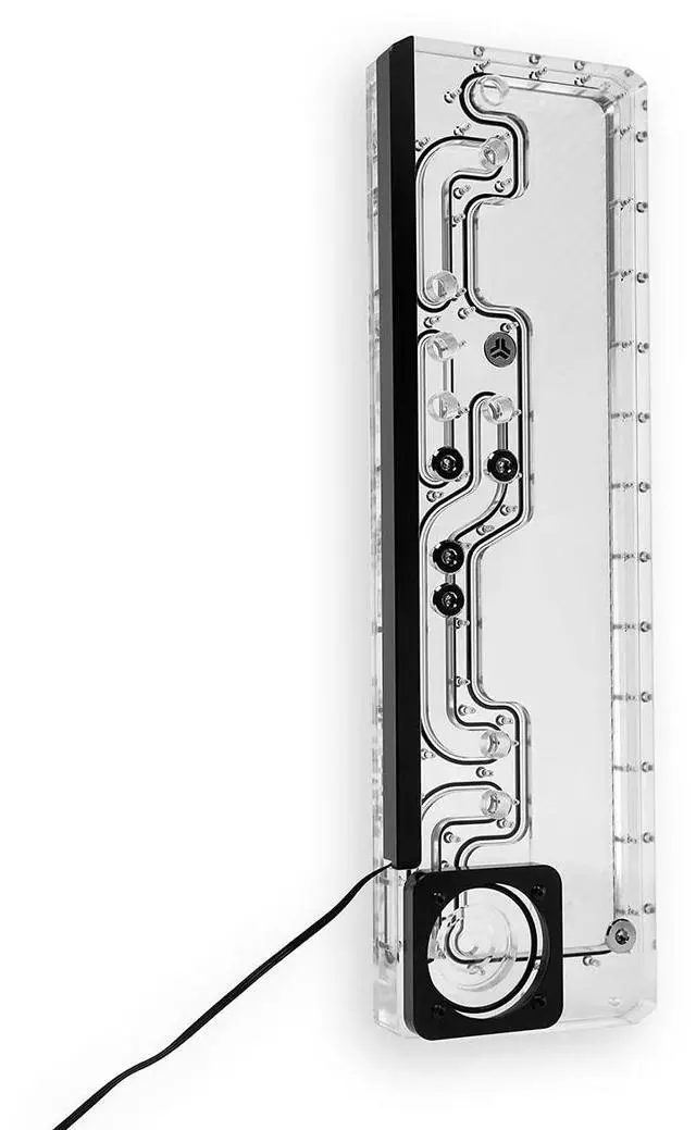 positioned for connection to: 1x CPU block1x GPU block (horizontal or vertical) up to 2x 360 mm radiatorsThe ports are strategically placed to minimize bending, allowing for a clean and efficient water cooling loop. Installation is to the right of the motherboard, directly onto the radiator mounting plate of the case. 4x M4x6 mm hex screws are included. The fit is perfectly matched to the Corsair 7000D cases. An integrated addressable D-RGB LED strip runs along the left side of the distroplate, creating stunning lighting effects. An anodized black aluminum cover hides unwanted hotspots for a clean look. The connection is via a 3-pin 5V D-RGB header on the motherboard and is fully compatible with ASUS Aura Sync, MSI Mystic Light, ASRock Polychrome, and other major systems. Pump CompatibilityThanks to an integrated universal adapter, the distroplate is compatible with both D5 and DDC pumps – maximum flexibility for pump selection and installation. Radiator Compatibility of the 7000D
