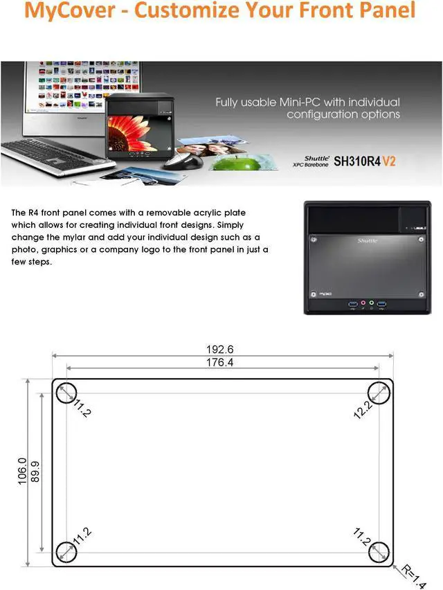 With the new SH310R4 V2, you can take full advantage of the performance and affordability in an expandable mini PC. Shuttle SH310R4 V2 is an entry-level mini PC supporting Intel Core processor of the 8/9th Gen. Featuring up to 8 cores of processing performance and integrated UHD graphics, the SH310R4 V2 has more power to handle demanding 4K workflows. With options for HDMI, DP and VGA outputs, users can gain better flexibility for simultaneous dual displays. Despite its seeming small chassis, there is enough room to accommodate up to 32GB of DDR4 memory, a fast M.2 SSD, a dual-slot graphics card, and even three storage drives. As desired, the front panel can also be fully customized to your needs.