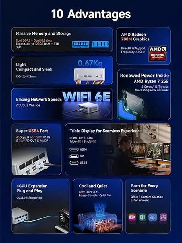 Triple Video OutputsThis X1 Lite-255 desktop computer is equipped with 1x HDMI2.1 FRL(Up to 8K@60Hz/4K@120Hz), 1x DisplayPort 1.4 (8K@60Hz/4K@144Hz), and 1x USB4 (8K@60Hz/4K@144Hz) outputs, which support multiple monitor displays at the same time and provide a larger and wider field of view, providing robust support for various scenarios such as office work, design, and multimedia entertainment.
