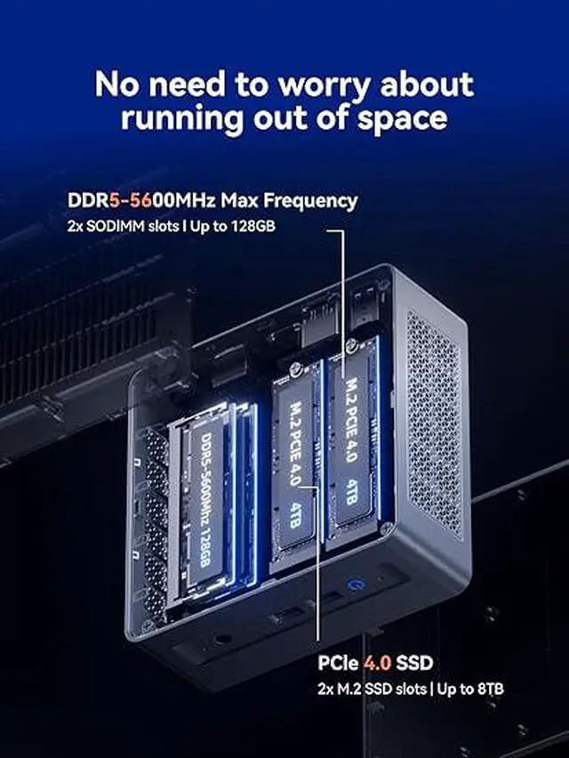 32GB DDR5 & 1TB SSDThe X1 Lite-255 Mini Computers come equipped with 32GB DDR5 5600MHz RAM (dual SO-DIMM slots, expandable up to 128GB) and a 1TB M.2 2280 PCIe 4.0 SSD. It features dual M.2 2280 PCIe 4.0×4 slots, supporting up to 4TB per SSD (total up to 8TB)perfect for high-speed data processing, rapid file transfers, and faster system responsiveness in demanding workloads.