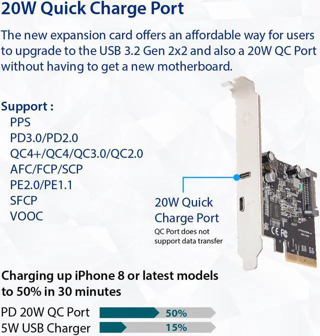 A single dedicated Power Delivery Port provides up to 20W of power through the SATA Power rather than the PCIE for a more stable power. USB C PD charger features fast charging Type-C Port with Power Delivery 3.0 with PD compatible devices.