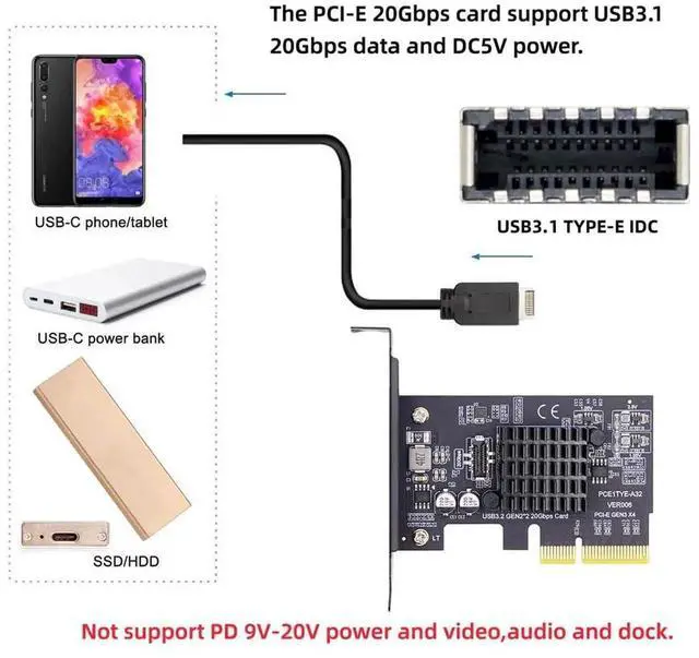 USB 3.2 Gen2 Type-E 20Gbps Front Panel Socket to PCI-E 4X Express Card Adapter for Desktop Motherboard