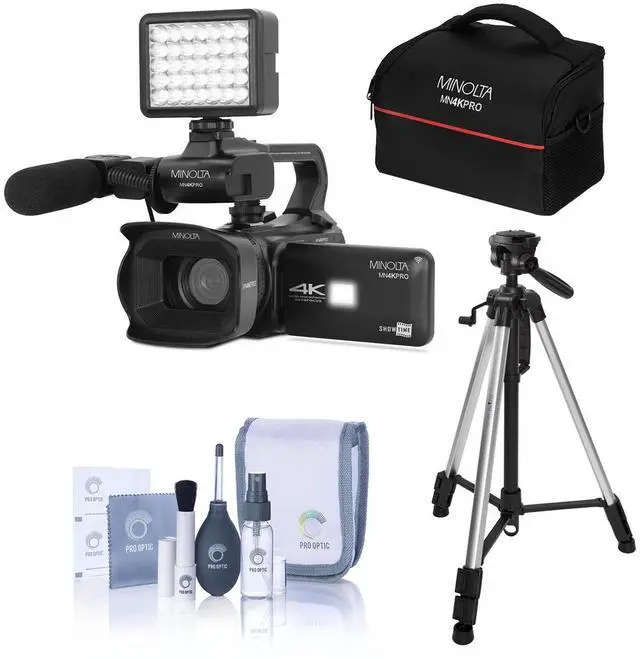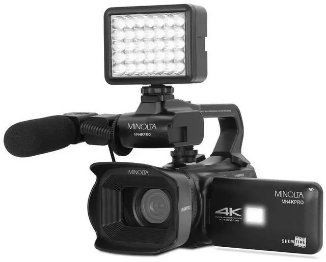 This camcorder kit comes complete with a range of professional attachments, including a lens hood to reduce glare, a handheld stabilizer for smooth footage, a stereo microphone for clear audio capture, and an LED video light for enhanced illumination in low-light conditions. The MN4KPRO also features built-in wireless integration, enabling effortless connection to your smartphone for easy photo and video sharing. With the Minolta ProShot app integration, you can control your camera and download your captured moments directly to your device. The camcorder is powered by a 3, 100 mAh high-capacity battery, ensuring extended recording times for those longer shoots.