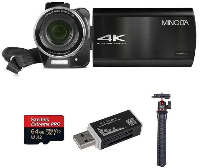 Discover the power and versatility of the MN4K100Z 28MP 4K Ultra HD Camcorder from Minolta. This sleek, high-tech device is designed to capture your world in stunning detail, recording video content in 4K Ultra HD resolution and capturing photos in a remarkable 28-megapixel resolution. This advanced camcorder is equipped with a 10x optical zoom and a 36x digital zoom, complete with stabilization technology. This allows you to frame your shots with precision and capture distant subjects with ease. The 3.5" high-resolution touchscreen LCD provides a clear, intuitive interface for easy operation and playback.