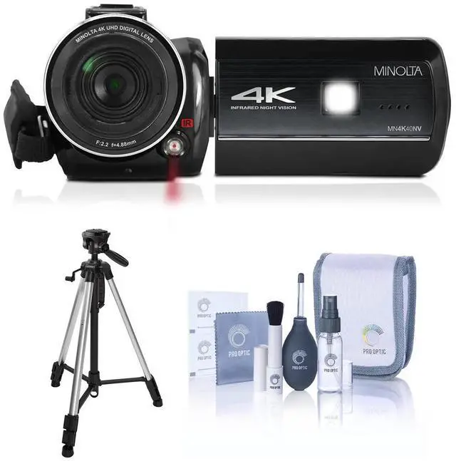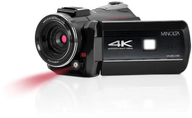 MINOLTA's MN4K40NV Camcorder records video content in 4K Ultra HD video and captures photos in 30 Mega Pixel resolution. Loaded with features, it includes a 16x digital zoom, anti-shake stabilization, face detection and a 3.0" high-resolution touch LCD. Its Night Vision capability uses an advanced infrared sensor that illuminates the scene in low light conditions. Easily add accessories with the integrated accessory-shoe mount. Included in the bundle are an AC adapter, Li-ion battery, remote control and 32GB SD card for hours of recording and hundreds of photos.