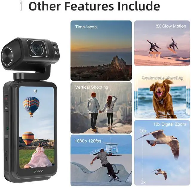 • 3.5-inch 180-degree Rotating Large ScreenThe ordro M3 handheld camera support Horizontal and vertical shooting modes can be freely selected to meet the needs of various scenes, yoga/travel/conference/food production/camping/parent-child/dinner /Vlog shooting.
