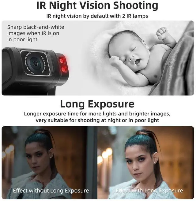 • Built in IR Night Vision Shooting Mode The Night Vision camera capabilities use an advanced infrared sensor illuminator to illuminate your view in the dark to capture videos & photos with clarity. Night vision camcorder for you!